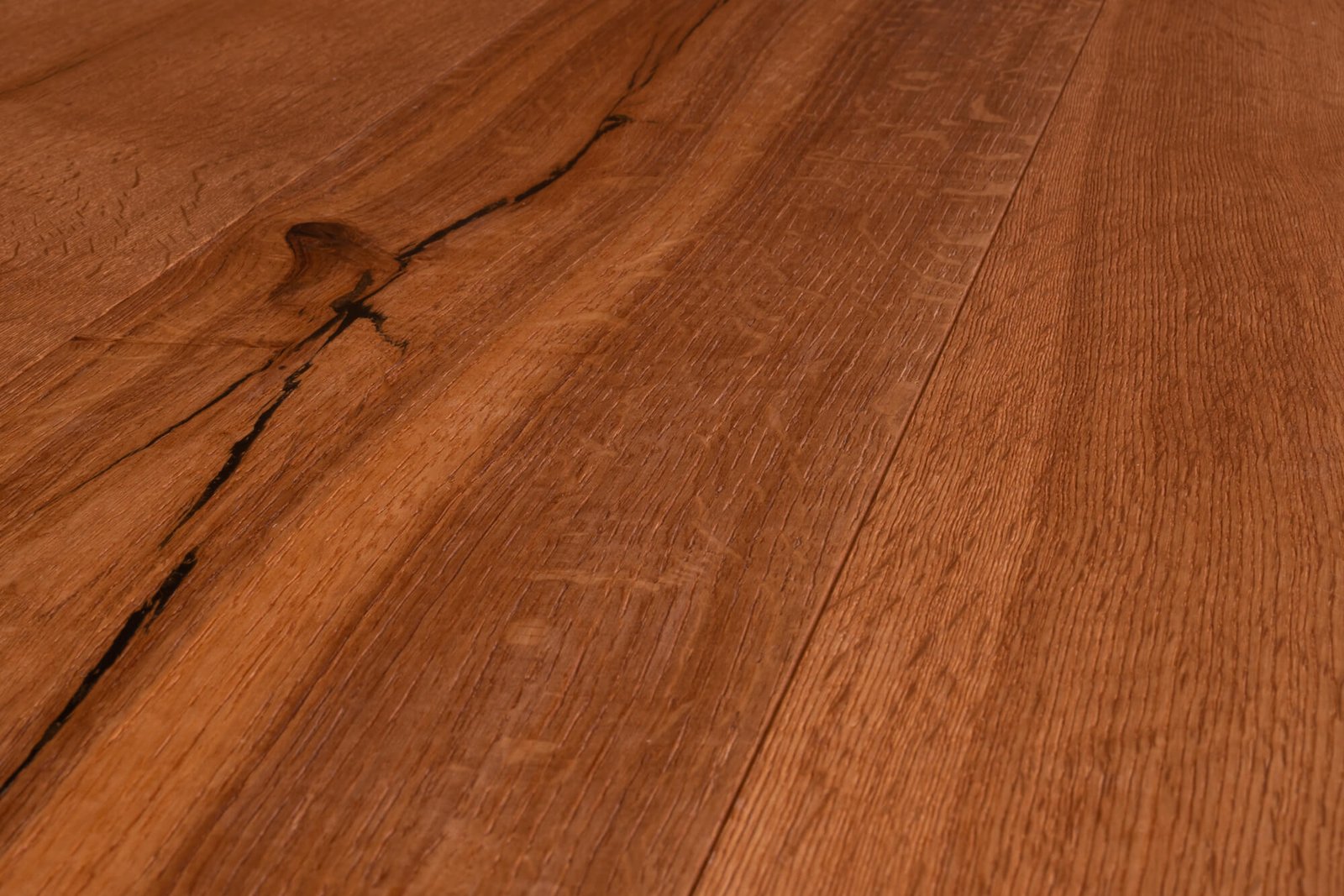 • Durch die händisch gehobelte Oberfläche entsteht eine spezielle Optik. Jede Diele wird dadurch zu einem Unikat und spiegelt den Charakter eines alten Dielenbodens wieder.