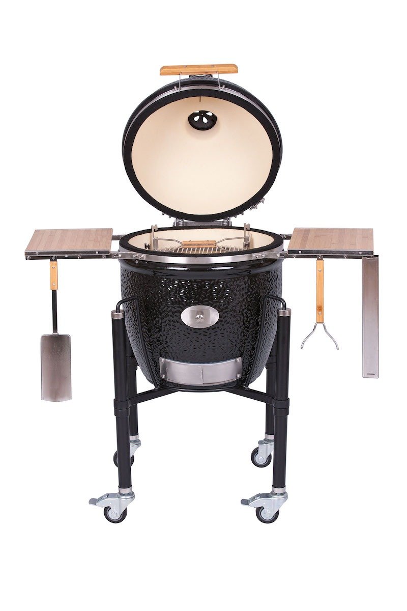 Die gute Nachricht für alle „Grillpflegemuffel“ +++ Der Monolith besteht aus Keramik und Edelstahl, die Griffe aus Bambusholz+++