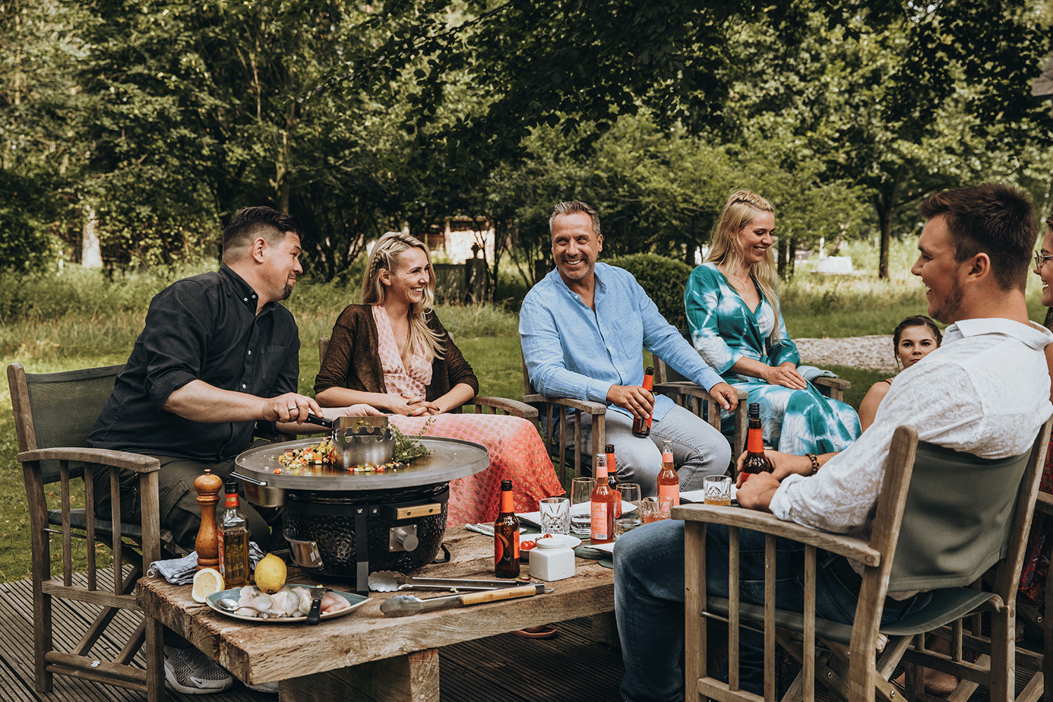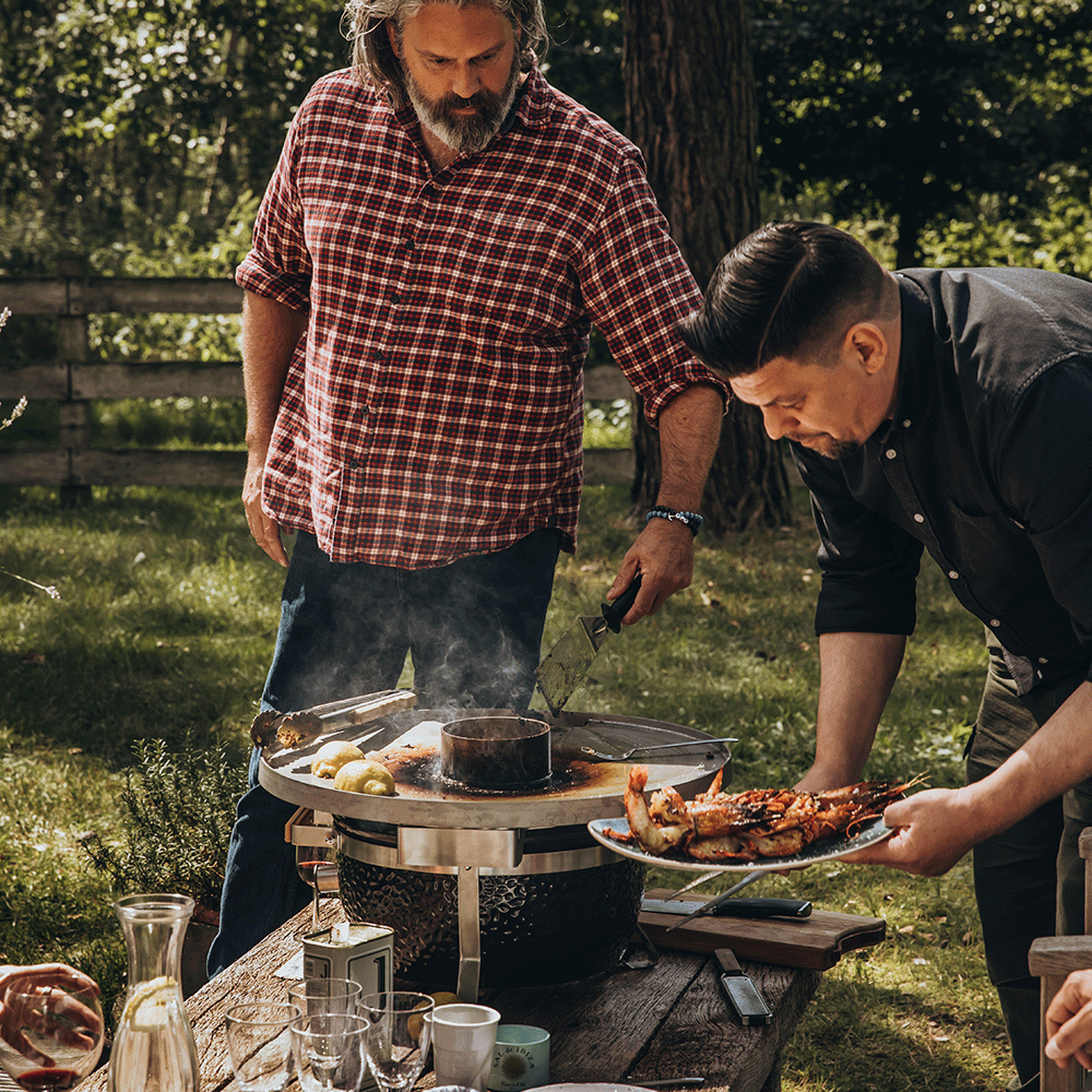 Er lässt sich so wie eine Art Plancha- oder Teppan-Grill nutzen, mit verschiedenen Temperaturzonen. Dort wo die Platte direkt über der Glut ist, ist die Hitze sehr stark, nach außen zu den Überständen etwas niedriger, das heißt man kann in der Mitte scharf anbraten und nach außen zum Garen und Warmhalten rausziehen.