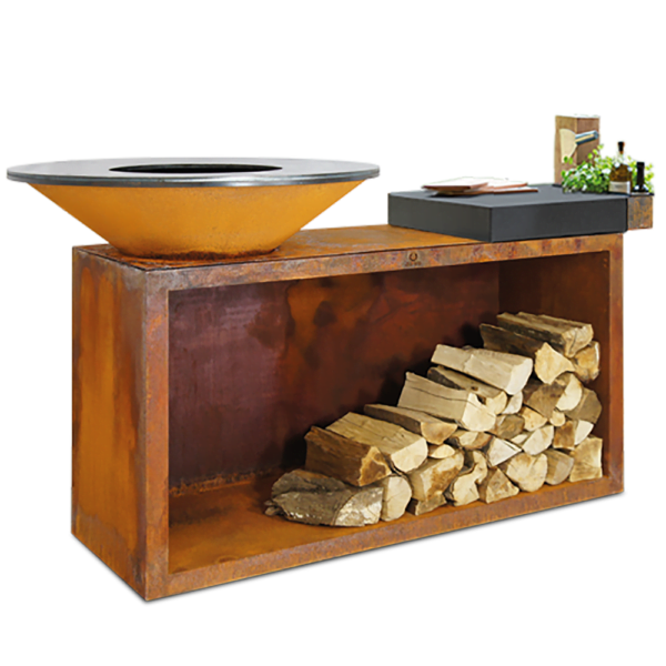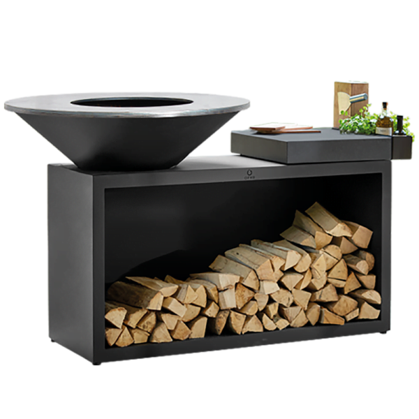 Der OFYR Island ist ein All-In-One-Produkt, das unübertroffene Eleganz und Funktion in einem kompakten Design vereint. Es umfasst eine OFYR-Kocheinheit mit Holzlager, ein robustes Schneidebrett und ein praktisches Ablagefach für Gebrauchsgegenstände und Gewürze. Der Durchmesser des Grills bei diesem Modell beträgt 100 cm. Das Schneidebrett ist aus Teakholz.
